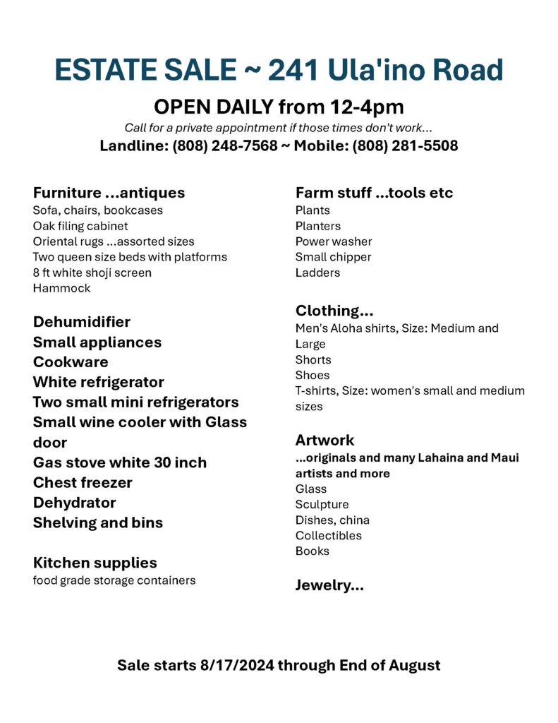 NOTICE OF SALE! August 9, 2024 was the last day of production and work at the Hāna Farmers Market …for the remainder of August there will be an Estate Sale ~ please come by or give a call…